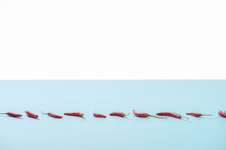 Red hot chili peppers arranging with white background and blank space. Garnish and food ingredients.