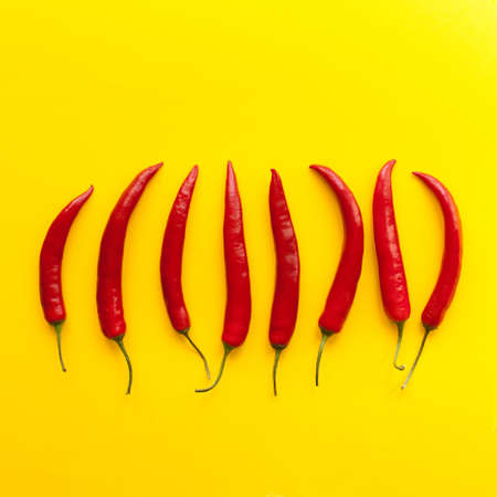 Vibrant red chili on yellow background, lay flat. Red spicy chili peppers wallpaper pattern