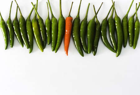 Red hot chili peppers arranging with white background and blank space. Garnish and food ingredients.