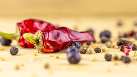 Two chilli peppers and a selection of spices (mustard, juniper) on a chopping board