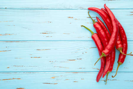 Top view of fresh chili peppers on blue surface, panoramic shot