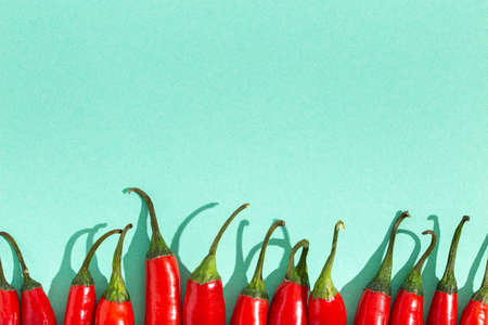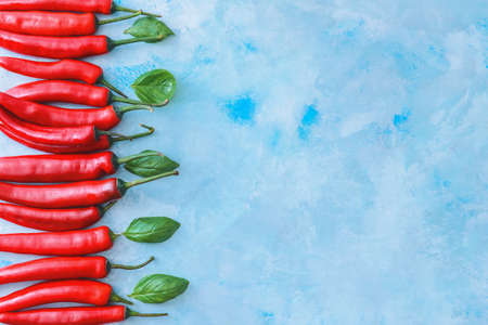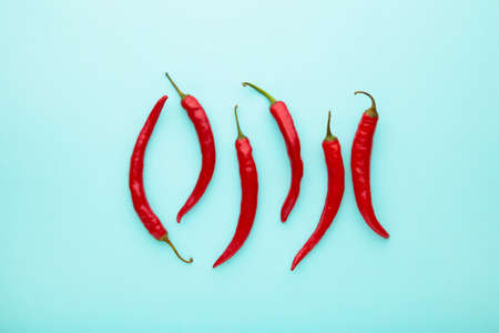 Very Hot Chili Peppers on Blue Paper Background Top View with Space for Text. Red Spicy Chilli Peppers Pattern or Backdrop for the Indian Menu for Oriental Food Design