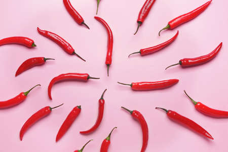 Red chilli peppers pattern on pink background. Top view. Hot pepper flat lay. Chili wallpaper