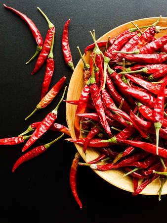 Dried red hot chili pepper in a golden wooden plate on the black background. Shallow dof.