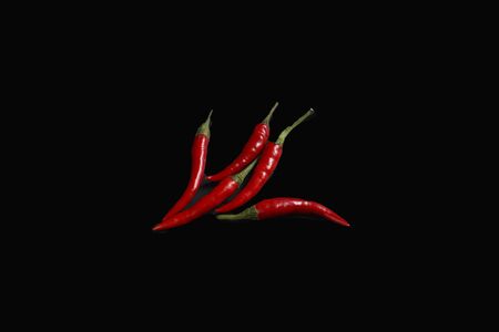 Five chilli peppers isolated on black background. Flat lay. Copy space.