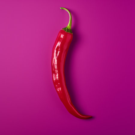a hot chili pepper, in the style of precise hyperrealism, is isolated on a pink background. the dark purple hues add depth to the large-scale photography, while the curves of the pepper evoke a traditional mexican style. softbox lighting enhances the advertising-inspired aesthetic of this captivating image. ai generated