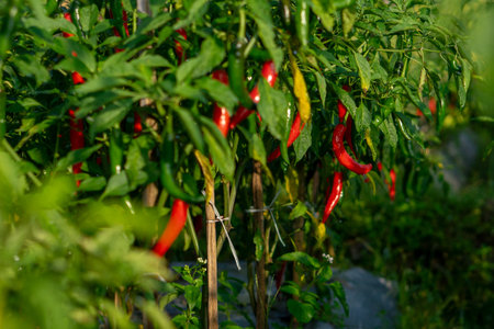 Close-up view of red chili peppers growing on lush green plants in neat rows, bathed in warm morning sunlight. Captures the essence of organic vegetable farming.