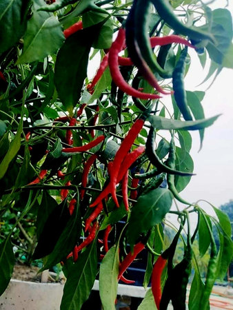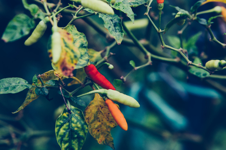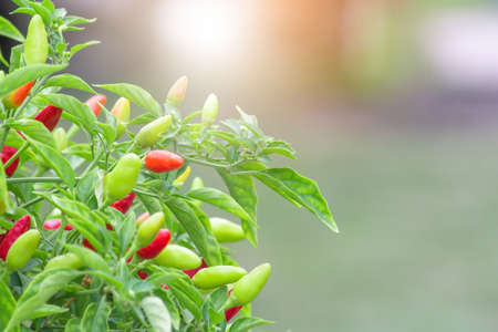 Red chili and green chili peppers on the tree in garden. Thai chilli tree agriculteral in organic farm in Thailand.