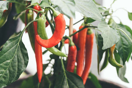 Potted hot chili pepper against blue sky on a sunny day. Three species of chili pepper plant in one pot: hot pops, multicolor and purple. Growing veggies on the windowsill. Indoors houseplant. Front view.