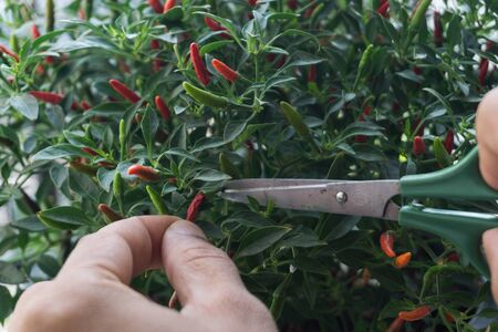 Red chilli peppers in the organic garden farm. Plants that are both food and herbs. Spices or essential ingredients in Thai cooking that are spicy.