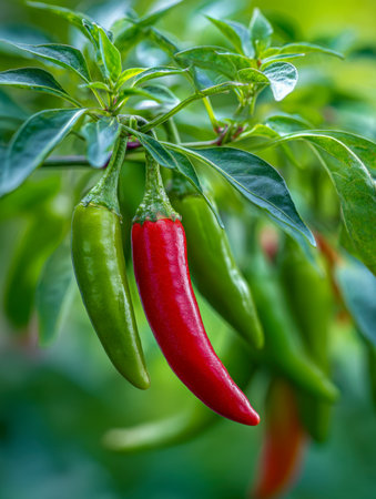 Bright red and green chilies thrive amidst glossy foliage in a sunlit garden, embodying fresh heat and vibrant nature in a lush outdoor environment.