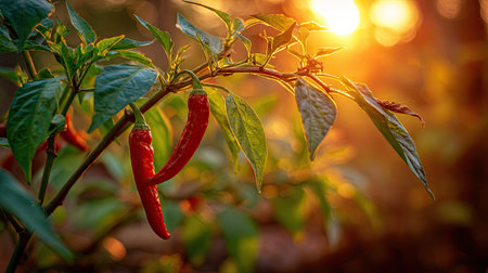The Chili pepper at sunset, Golden red sunset light filters through the leaves, still atmosphere, warm orange glow blending with natural green tones.