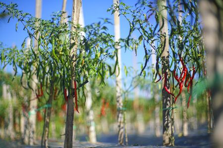 Chilli peppers or green chilies in farm gardening is vegetable use for ingredient of Thai food