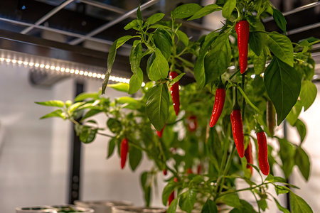 Vibrant red chili peppers grow on indoor plants featuring lush green leaves in a hydroponic setup. Ideal for fresh produce enthusiasts and gardening showcases.