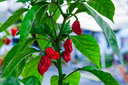 Chili in garden organic, Red, very hot and spicy chilli peppers on an asian market. Healthy and vegetarian eating.