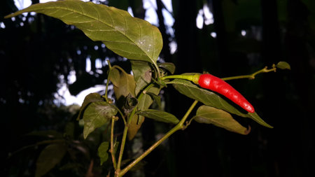The background of the chili tree and its fruit is red. Photo taken in the forest.