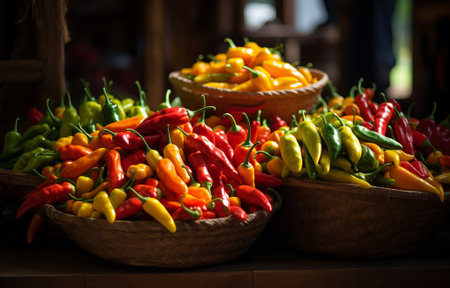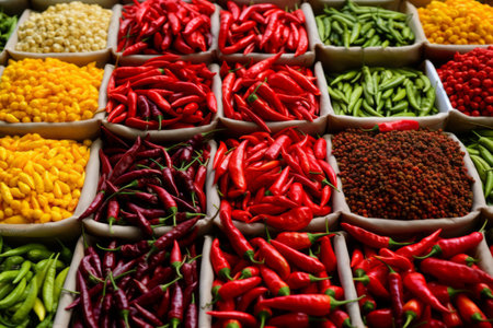 Market stand filled with different hot pepper varieties. Generative AI illustration