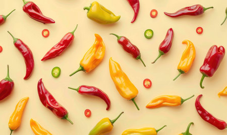 Vibrant red chili on yellow background, lay flat. Red spicy chili peppers wallpaper pattern