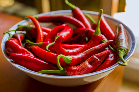 Red hot chili peppers in a bowl on wooden background. Selective focus.