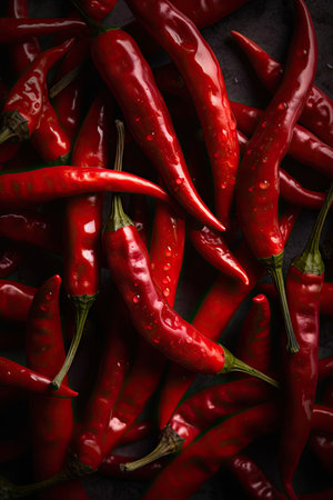 A beautiful arrangement of fresh red chili peppers on a dark stone surface. This vibrant image captures the essence of flavor and spice for culinary enthusiasts.