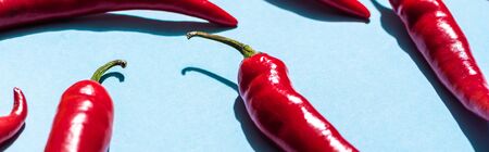 Panoramic shot of chili peppers with shadow on blue background