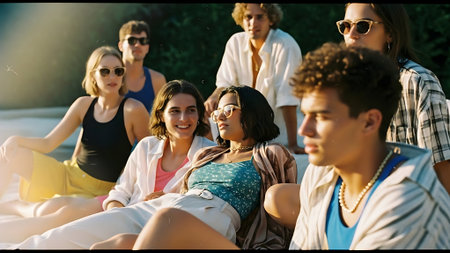 A diverse group of young friends sitting together outdoors on a sunny day, wearing sunglasses and casual outfits. The scene captures a relaxed, social, and modern vibe.