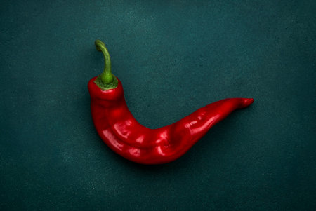 Fresh red hot chili pepper on deep green background, minimalistic style, vegetable art, top view
