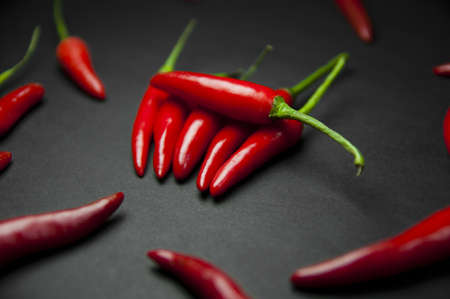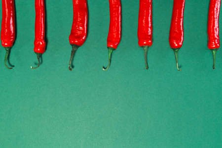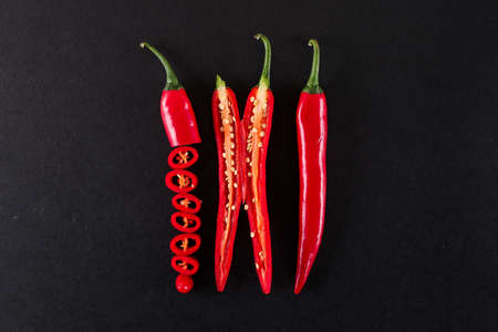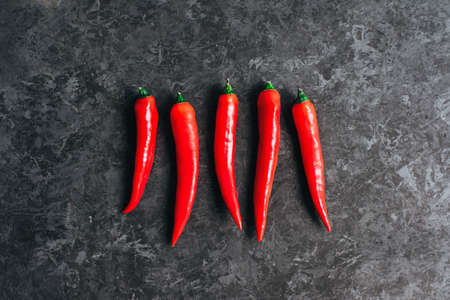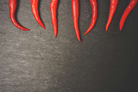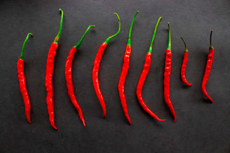 Row of red hot chili peppers on black background. Pods of chili peppers. Hot healthy seasoning.