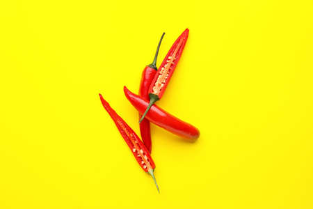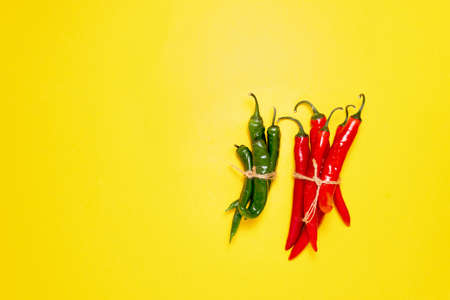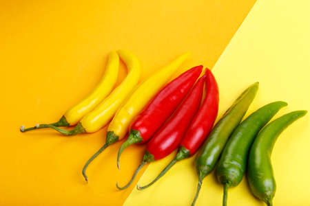 Yellow, red and green hot pepper on a yellow and orange background. Top view from an angle