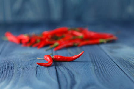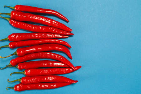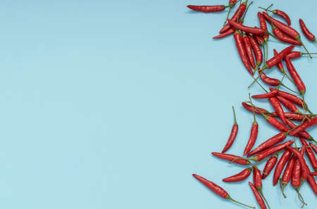 Very Hot Chili Peppers on Blue Paper Background Top View with Space for Text. Red Spicy Chilli Peppers Pattern or Backdrop for the Indian Menu for Oriental Food Design