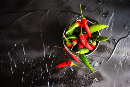 Organic chilli peppers on a pan on dark wooden background with copyspace