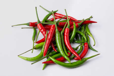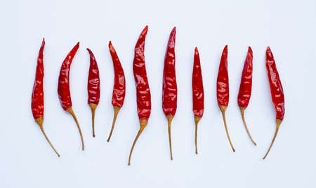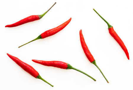 Top view some of the red chili or Jinda Chili in Thai language, close up image, arranged fresh chili as a pattern on white background.