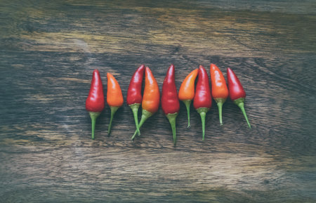 hot red pepper mini chili pods on wooden background, horizontal row of hot vegetables