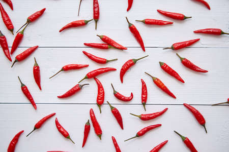 Red hot little chili peppers pattern isolated on white wooden table background. Top view. Flat lay