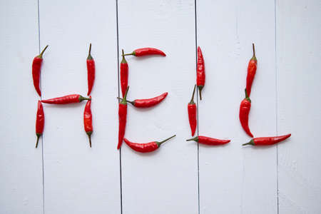 A word HELL formed with small red chilli peppers. Placed on white wooden table. Top View.