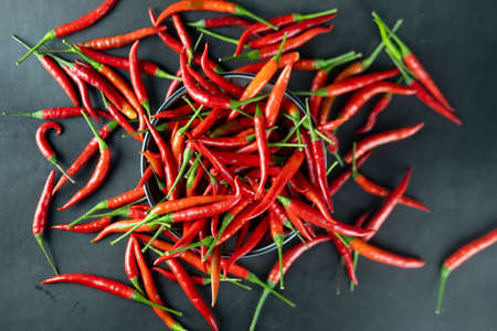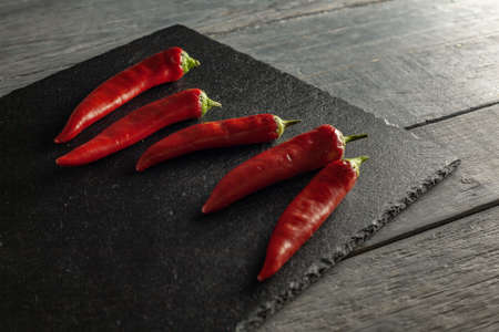 Closeup red hot chilli pepper on black wooden board.a lot of chili before cooking,spicy herbs,macro food photo