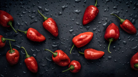 Peppers, cherry peppers, spicy and hot, overhead flat lay, top view on black, AI generative