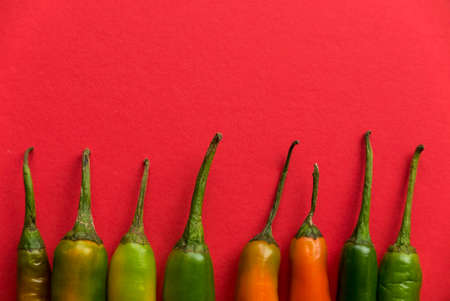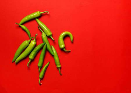 a pile of hot green chili peppers on a red surface. Top view, copy of the space, horizontal
