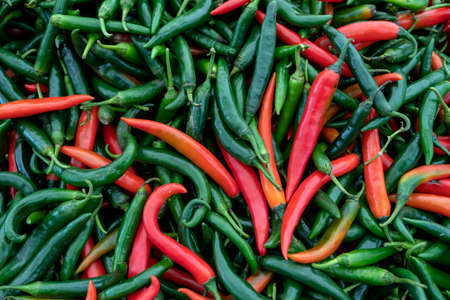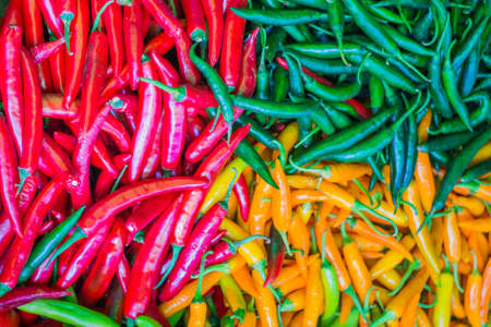 Bright red, green, and yellow chili peppers are piled high, showcasing their freshness and variety.