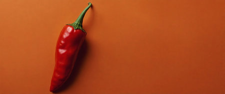 AI Generated. A vibrant flat lay perspective of a single hot red chili pepper on a bright orange background It serves as a food themed design banner with ample copy space image