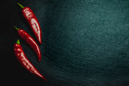 Three chilli peppers on black slate board. Flat lay. Copy space.