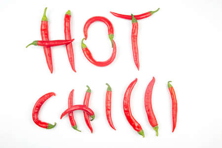 Red hot chili peppers are lined with letters on a white background. Vitamin vegetable food
