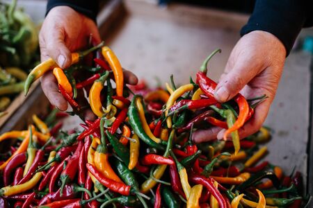 a colorful mix of the freshest and hottest chili peppers. Hot peppers in farmers hands