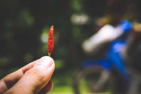 Hot and spicy Red Chilli on hand,Dried red chili,Pepper,Chillies as background for sale in a local food market,thai food ,close up,texture,spice medicinal properties.