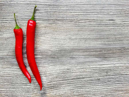 hot red pepper mini chili pods on wooden background, horizontal row of hot vegetables