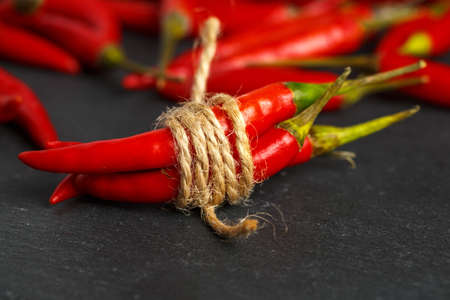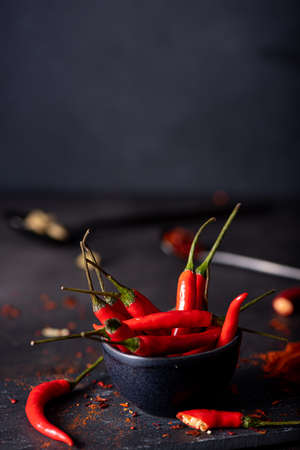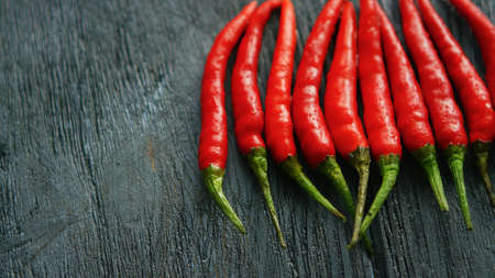 Closeup red hot chilli pepper on black wooden board.a lot of chili before cooking,spicy herbs,macro food photo