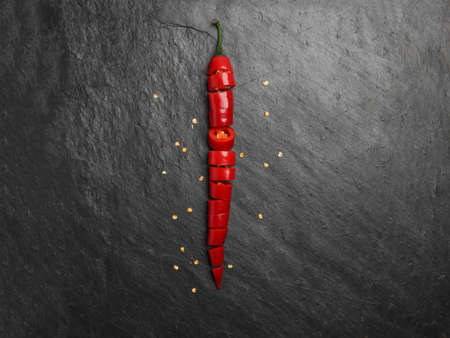 Chillies on slate, stone grunge texture. Vintage tone. Food Copy Space