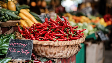 A basket overflowing with fresh red chili peppers at a local market stall, surrounded by other colorful vegetables and handwritten price signs.