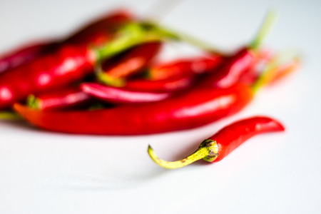 Red hot chili peppers arranging with white background and blank space. Garnish and food ingredients.