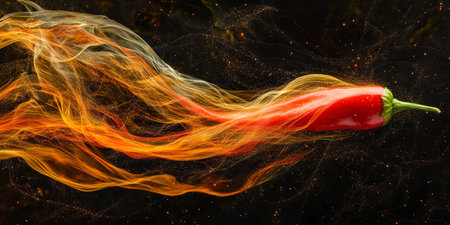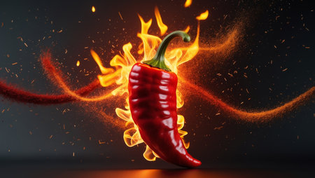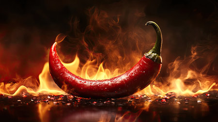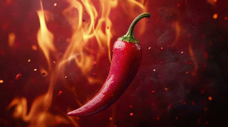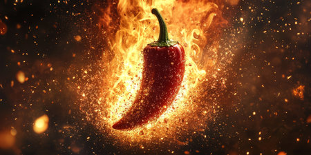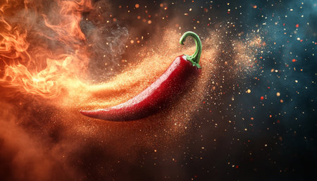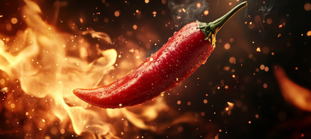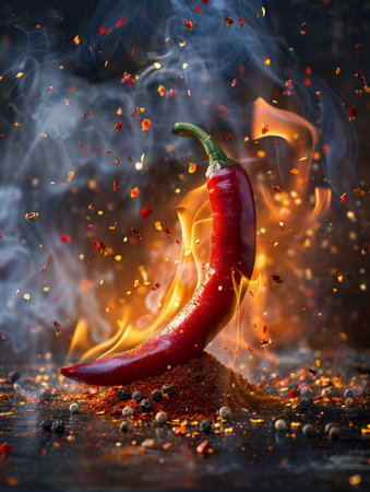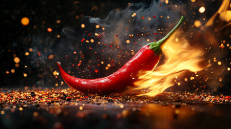 Fiery red chili pepper surrounded by flames and spices, vibrant and dynamic. Spicy food and heat concept